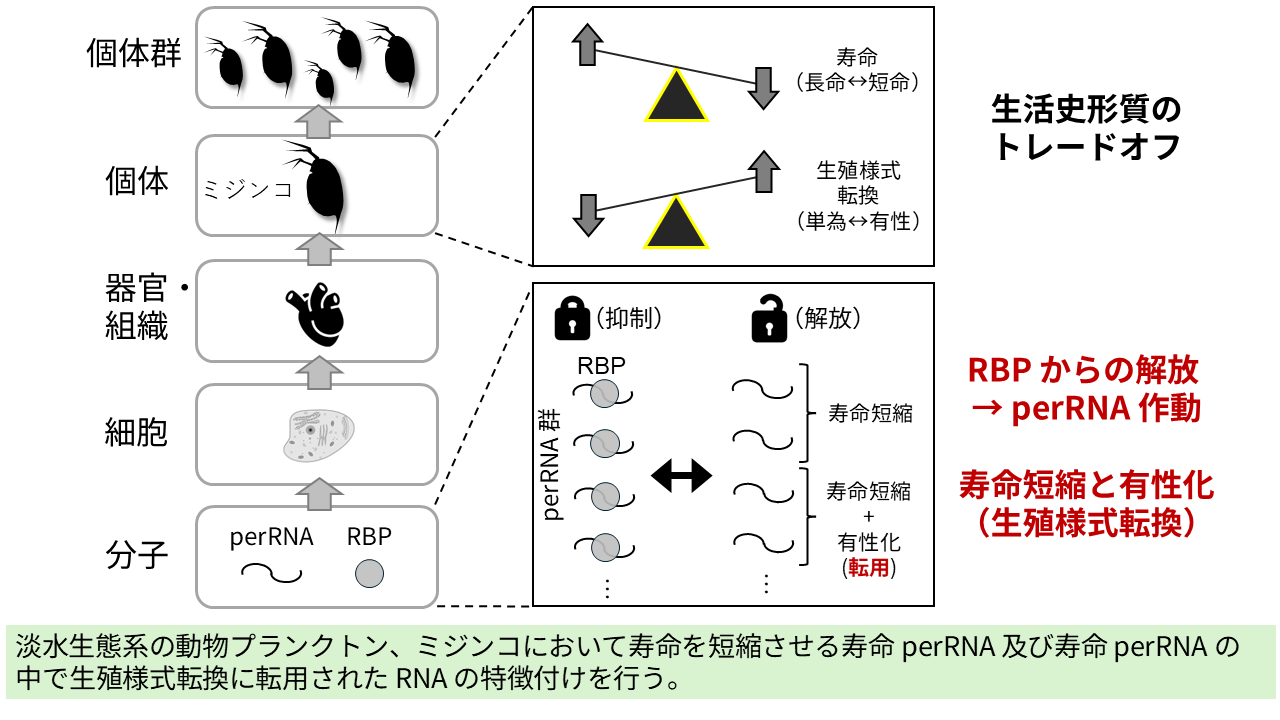 本研究では、淡水生態系に生息する動物プランクトン・ミジンコを用い、RNA結合タンパク質(RBP)による抑制から解放されることで短命化を引き起こす寿命perRNAを同定します。さらに、その一部が単為生殖から有性生殖への生殖様式転換の制御に転用されているかを明らかにし、perRNAが駆動する生活史形質のトレードオフの分子メカニズムを解明します。併せて、摂動実験とRNA二次構造解析により各perRNAを特徴付け、資源化します。