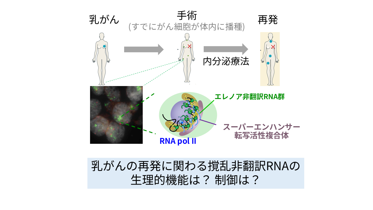 そこで本研究では、乳がんで過剰発現する非翻訳RNA群を内因性撹乱RNAと捉え、その作用・制御機序を精査し、正常個体での機能や抑制制御との関連づけをすることを目的とします。具体的には、エストロゲン受容体陽性乳がんが内分泌療後に再発する過程で過剰発現する、非翻訳RNAエレノアのスーパーエンハンサーへの寄与などを検証します。また、エレノアRNAを標的とする核酸医薬の開発基盤を築きます。がんが生理的RNAをいかに内因性撹乱RNAへと転用するかを明らかにし、個別化医療への道筋をつけます。