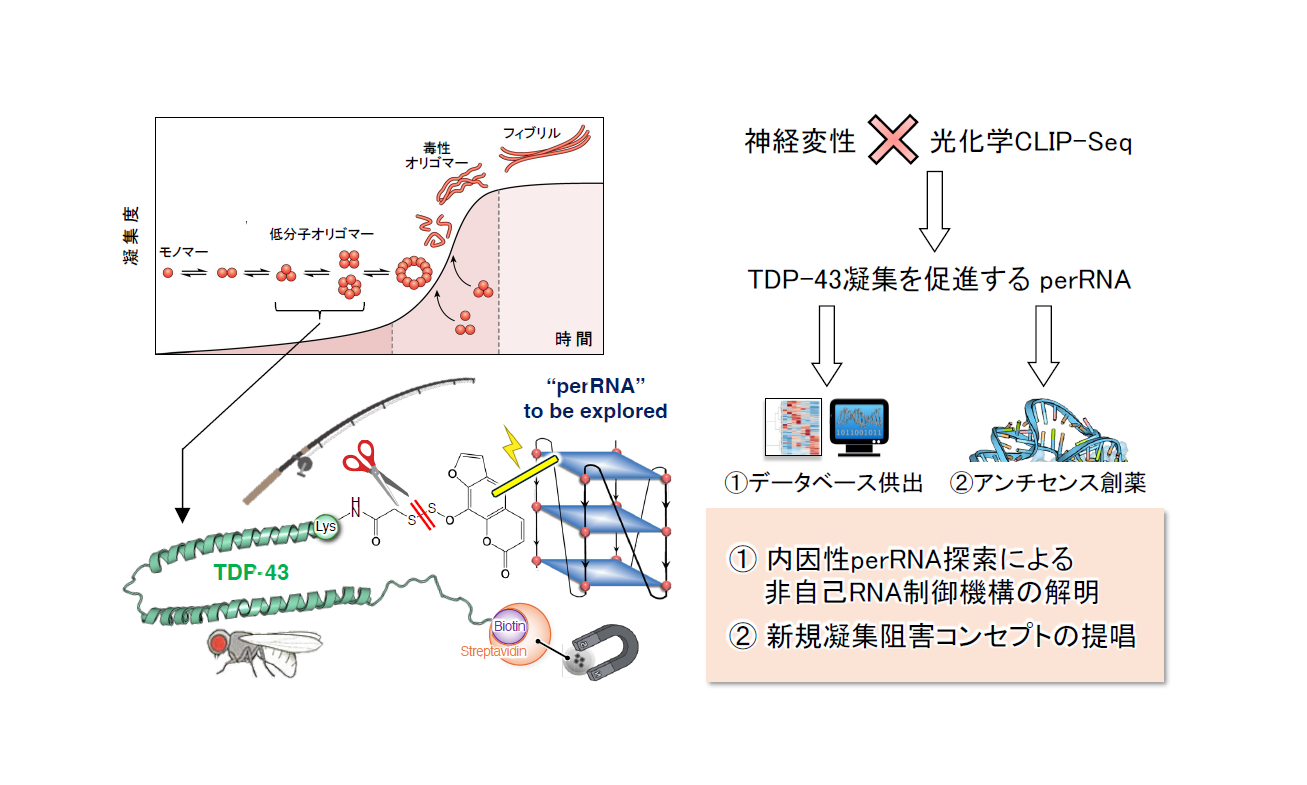 本研究では、ショウジョウバエ神経変性モデルを用い、ALS病因性RBPのTDP-43に結合するRNAを光化学CLIP-Seq法により網羅的に解析します。これにより、アミロイド凝集性をもつperRNAの特徴を明らかにし、治療薬開発へとつなげることを目指します。さらに、得られたRNA情報をperRNAデータベースの基盤データとして供出し、中枢神経疾患研究の発展に貢献します。
