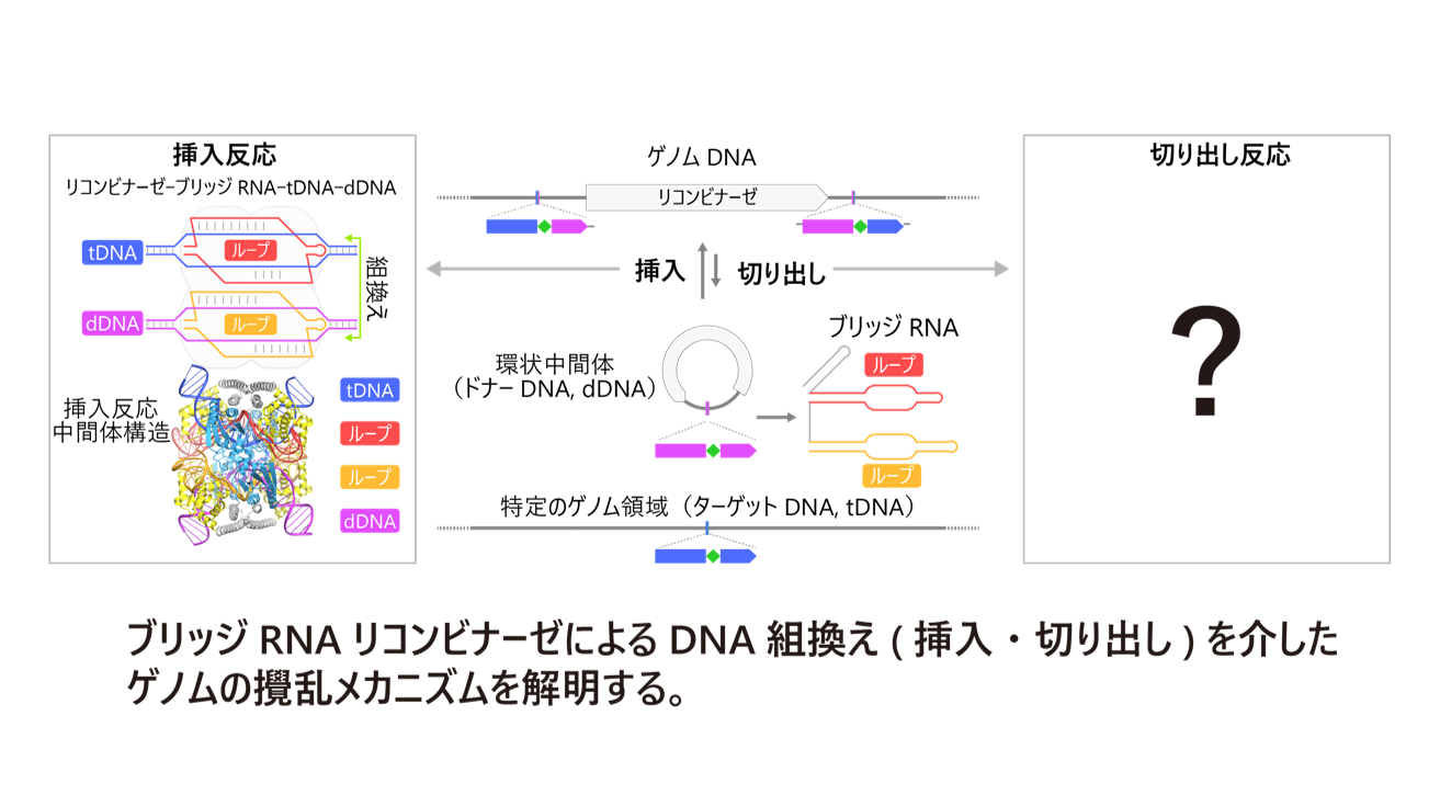 生物の進化と多様性は、トランスポゾンによるゲノムの攪乱を通じて形成されてきた。IS110ファミリーは、リコンビナーゼがブリッジRNAを介してドナーDNAと標的DNAを同時に認識し、RNA依存的にDNA組換え(挿入・切り出し)を触媒することで転移するという、従来にないトランスポゾンである。我々は世界に先駆けてその分子機構を明らかにしたが、切り出し過程の詳細や標的特異性の向上には未解決の課題が残されている。